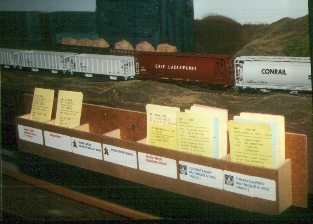 Through hopper trains on the double ended Conrail staging tracks may simply have the car card/waybill pack turned around in the box to be ready for the next session. This keeps empties moving west and coal moving east.